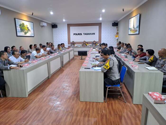 Bertempat di ruang Vicon Sarja Arya Racana, Sabtu ( 19/8/2023 ) pukul 09.00 s/d 14.50 Wita berlangsung Anev Bulanan Situasi Kamtibmas Polres Tabanan yang dipimpin oleh Kapolres Tabanan AKBP Leo Dedy Defretes, S.H., S.I.K., M.H.