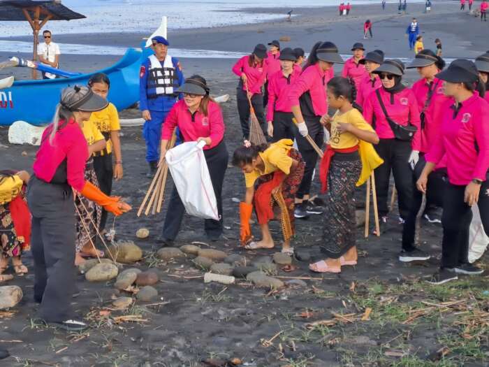 Selesai pembagian sembako acara dilanjutkan Ibu Kapolda Bali Melaksanakan kurve ( bersih -bersih ) di Pantai Yeh gangga.