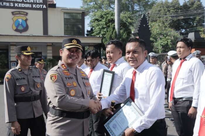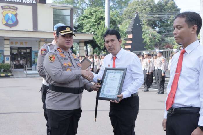 Kapolres Kediri Kota AKBP Wahyudi S.I.K.,M.H. memimpin upacara langsung dan sekaligus memberikan penghargaan kepada anggota yang berprestasi.