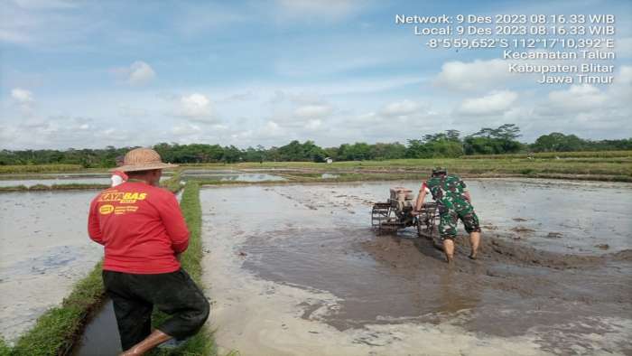 Blitar || Faktaperistiwanews.co, – Untuk mendukung ketahanan pangan di wilayah binaannya, Babinsa Koramil 0808/16 Talun Kodim 0808/Blitar Sertu Supiyansyah, melaksanakan kegiatan membantu warga binaannya, dalam pengolahan dan penyiapan lahan pertanian untuk tanam padi, kegiatan ini dilaksanakan di Desa Wonorejo Kecamatan Talun Kabupaten Blitar, Sabtu (9/12/2023).