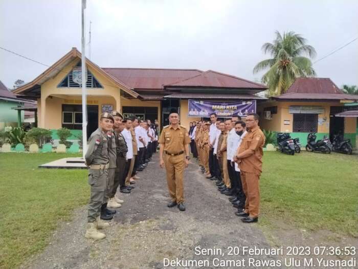 Kegiatan prosesi hari pertama camat Rawas Ulu masuk kerja dan ngantor di kecamatan Rawas Ulu tersebut apel pagi bersama pegawai kecamatan, lurah dan pegawai kelurahan Surulangun Rawas.