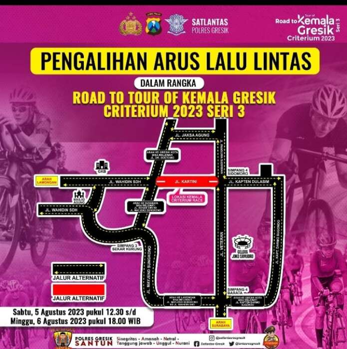 Sehubungan dengan diadakannya road to tour Kemala seri 3 Gresik Criterium 2022 Jalan Kartini Gresik ditutup pada Sabtu, 5 Agustus 2023 pukul 12.30 Wib sampai dengan Minggu, 6 Agustus 2023 pukul 18.00 Wib.