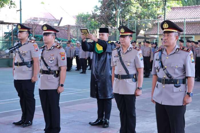 Kapolres Kediri AKBP Agung Setyo Nugroho S.I.K memimpin langsung prosesi Sertijab di lapangan Indoor Mapolres Kediri, Rabu (12/7/2023) pagi.