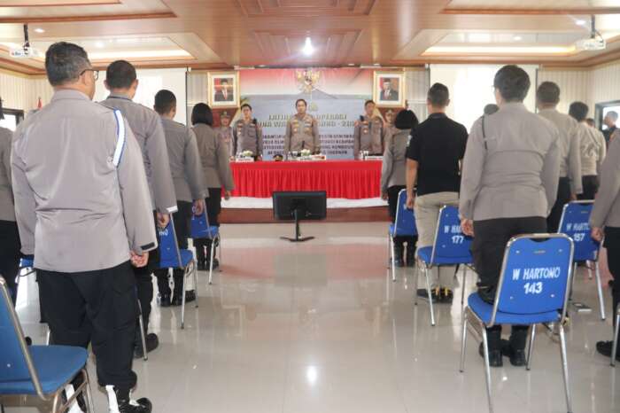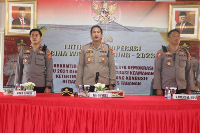 Adapun Arahan Kapolres pada intinya menyampaikan Marilah Kita Memanjatkan Puja Dan Puji Syukur Kehadapan Tuhan (Ida Sanghyang Widhi Wasa) Karena Berkatnya Hari Ini Kita Masih Diberikan Kesehatan. Untuk Dapat Melaksanakan Latpraops Bina Waspada Agung-2023 Dalam rangka meningkatkan harkamtibmas menjelang Pesta Demokrasi Pada Pemilu 2024 Demi Terciptakan Situasi Keamanan Dan Ketertiban Masyarakat Yang Aman Kondusif”.