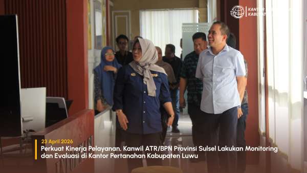 Luwu // faktaperistiwanews. co – Kantor Pertanahan Kabupaten Luwu menerima kunjungan Plt. Kepala Kantor Wilayah ATR/BPN Provinsi Sulawesi Selatan, Ir. Syamsuddin K., S.SiT., M.H., QRMO, dalam rangka monitoring dan evaluasi kinerja pelayanan. Kegiatan ini berlangsung di Aula Bhumi Sawerigading Kantor Pertanahan Kabupaten Luwu, Kamis (23/04/2026), dan dihadiri oleh seluruh jajaran.