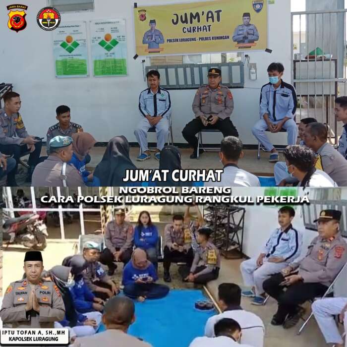 Hadir dalam acara giat Jum’at Curhat tersebut diantaranya yaitu Kapolsek Luragung IPTU Topan Alamsyah, Kanit Binmas, Kanit Intel, Kanit Propam dan Bhabinkamtibmas Polsek Luragung, tokoh Pemuda dan tokoh masyarakat setempat.