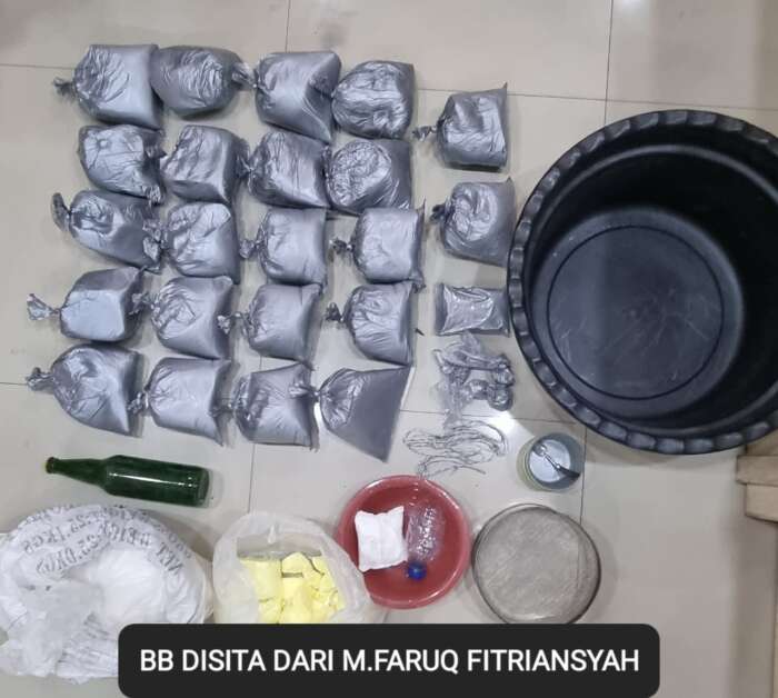 Setelah dilakukan penggeledahan, petugas berhasil menyita sejumlah barang bukti berupa 26 kantong plastik serbuk mercon. 22 diantaranya dengan berat masing-masing 1 kg, 3 dengan berat masing-masing 20 gr, dan 1 dengan berat 100 gr.
