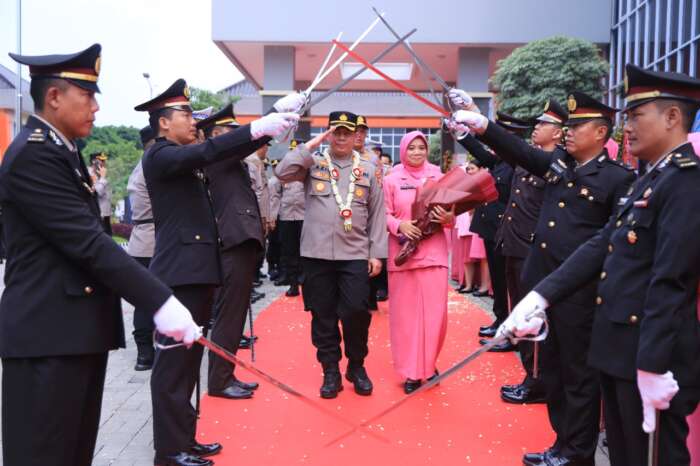 Kapolres Gresik AKBP Adhitya Panji Anom disambut langsung oleh AKBP Mochamad Nur Azis dan Ibu dengan pemberian kalung bungah serta sorban dihalaman Mapolres Gresik,kemudian pertunjukan musik angklung oleh siswa SLB Kemala Bhayangkari 2 Gresik.