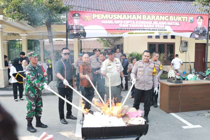 KEDIRI || faktaperistiwanews.co – Polres Kediri memusnahkan barang bukti hasil operasi cipta kondisi. Pemusnahan itu dilakukan di halaman Mapolres Kediri, Jumat (29/12/2023) sore.