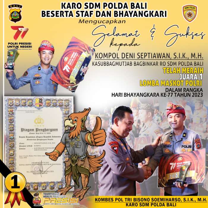 Bali || Faktaperistiwanews.co, – Dalam rangka Hari Bhayangkara-77, perwakilan Polda Bali Kompol Deni Septiawan, S.I.K., M.H. Kasubag Mutjab Bag Binkar Ro SDM Polda Bali dengan maha karyanya yang diberi nama “RAWAKOTA”, sukses raih juara 1 lomba maskot Polri, kamis (13/7/2023).