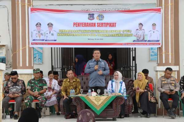 Kegiatan Berlangsung Wakil Bupati di Kabupaten Tanjung Jabung Barat, Dr. H. Katamso SA, SE, ME, menyerahkan sertifikat tanah kepada masyarakat Kecamatan Merlung melalui Program Pendaftaran Tanah Sistematis Lengkap (PTSL). Kamis 19-06-2025.