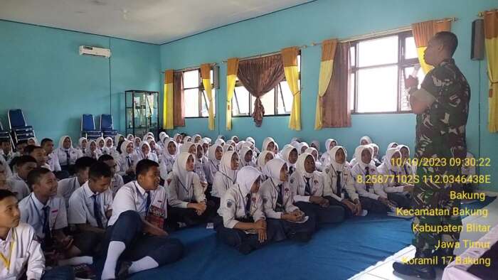 Untuk mewujudkan generasi muda yang berkualitas, anggota Koramil 0808/17 Bakung Kodim 0808/Blitar Pelda Tulus Widodo, melaksanakan kegiatan memberikan wawasan kebangsaan kepada siswa siswi, bertempat di SMKN 01 Bakung Kec. Bakung Kab. Blitar, Selasa (10/10/2023).